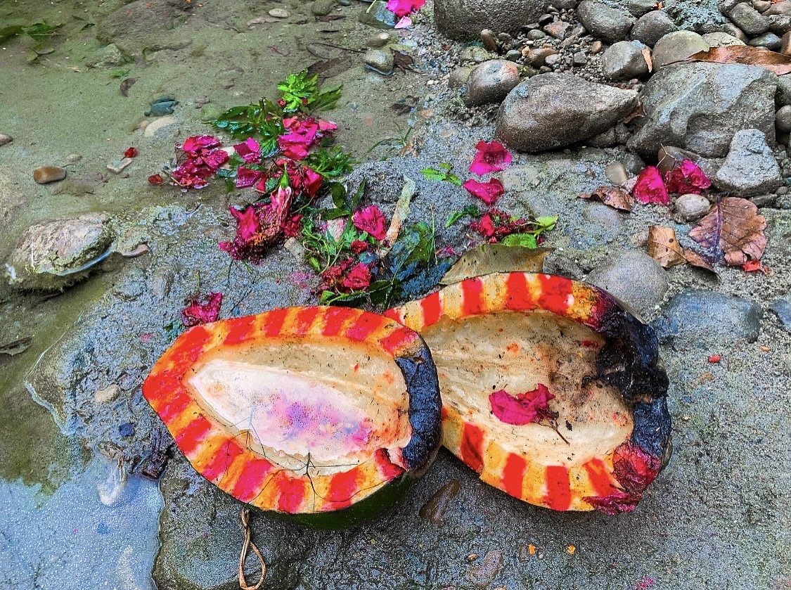 We stumbled across painted coconuts by the water, surrounded by flower petals ~ a beautiful offering to the Hindu god Shiva.